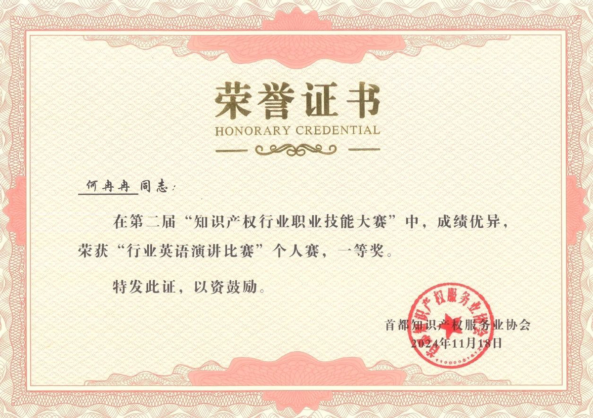 近日,在北京市知识产权局、海淀区市场监督管理局(区知识产权局)的指导下,由首都知识产权服务业协会主办,中国知识产权研究会专利专业委员会、北京(中关村)国际知识产权服务大厅承办的第二届“知识产权行业职业技能大赛”圆满落幕,集佳多位代理人与商标参赛团队在本届大赛中斩获多项佳绩。在“行业英语演讲比赛”个人赛中,何冉冉力战群雄,拔得头筹荣获一等奖,王茸茸、王瑜荣获三等奖;在商标综合技能比赛中,集佳参赛的两支队伍均取得优异成绩,由黎琳、赵敏敏、张雅静三位组成的队伍获得二等奖,由李晴、伍君、曾珍三位组成的队伍获得三等奖。