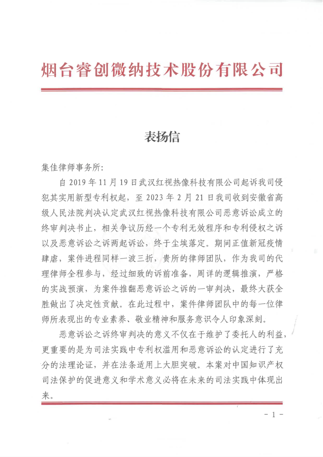 2023年2月10日,安徽省高级人民法院就烟台睿创微纳技术股份有限公司、烟台艾睿光电科技有限公司、安徽英睿系统技术有限公司等(下称“睿创集团”)与武汉红视热像科技有限公司(下称“武汉红视”)因恶意提起知识产权诉讼损害责任纠纷一案作出终审判决,认定武汉红视滥用诉权的行为构成恶意诉讼,并判令其赔偿睿创集团相应的合理支出。至此,时隔四年,横跨疫情时代的专利侵权及恶意诉讼系列纠纷案,终于尘埃落定。九球直播协助睿创集团最终取得系列案件的全面胜利,维护了客户合法权益,实现了商业竞争的公平正义!