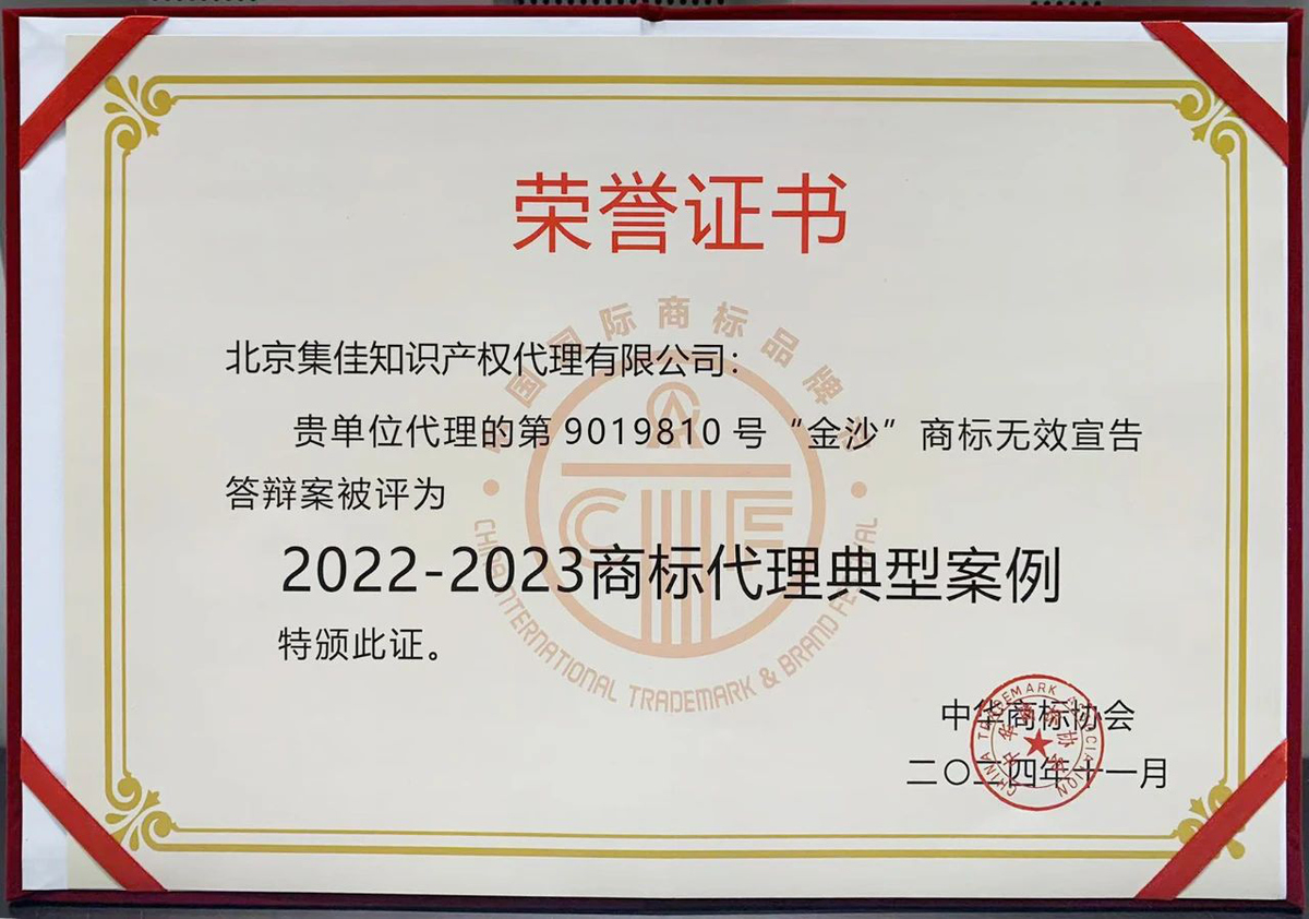 2024年11月24日下午,在商标节经典论坛之一的商标典型案例评析会议上,九球直播代理的“金沙”商标权无效宣告答辩案入选“2022-2023商标代理典型案例”。